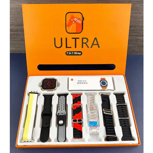 - Product Details of 7in1 Ultra Smart Watch With Straps Metal Ocean Rubber Nylon Wireless Charger Bt Call In Ultra SmartwatchIntroducing the 7in1 Ultra Smart Watch, a game-changer in wearable technology. Packed with an array of cutting-edge features, this watch is designed to enhance your lifestyle like never before.With its sleek and stylish design, this watch comes with interchangeable straps made from high-quality materials such as metal, ocean rubber, and nylon. Choose a strap that matches your mood or outfit effortlessly.No more tangled wires or hassle of carrying around charging cables. The wireless charger included with the smartwatch ensures convenient and fast charging on the go. Stay connected without interruption.Experience the convenience of hands-free calling directly from your wrist. With Bluetooth call functionality, you can make and receive calls seamlessly without reaching for your phone.This ultra smartwatch is a perfect companion for those who value style, functionality, and versatility. Get ready to elevate your wearable experience with the 7in1 Ultra Smart Watch.